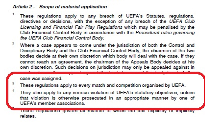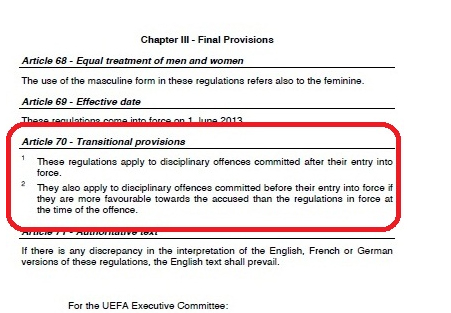 Yeni talimat aynı zamanda UEFA'ya, şike, doping ve ırkçılık gibi ihlallerde üye yerel federasyonun verdiği kararı az ya da yetersiz bulması halinde bu kararın değiştirilmesini veya tatmin edici bir kararın verilmesini talep etme ve bu talebin yerel federasyon tarafından yerine getirmediği takdirde de ülke federasyonuna da müeyyide uygulama yetkisi veriyordu. UEFA Disiplin Kurulu da bu dosya ile ilgili olarak 2013 versiyonunun uygulanmasına karar vererek yargılamasını bu yönde yapmıştı.
